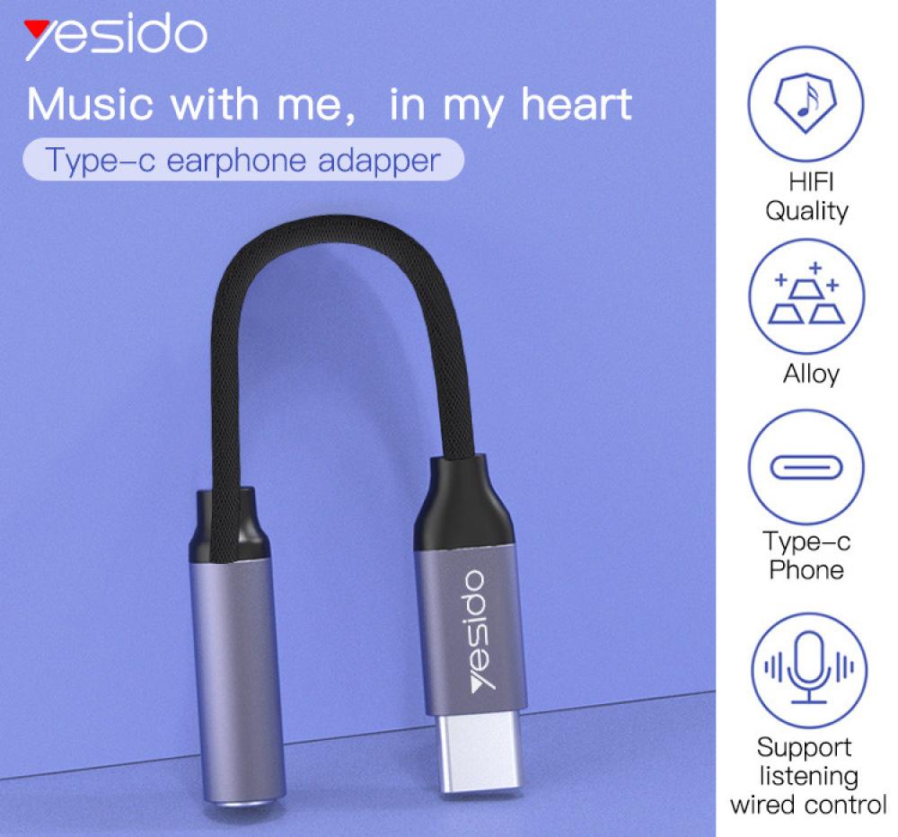 Yesido-يسيدو - YAU-19 محول كابل الصوت من USB-C إلى مدخلAUX - مقبس 3.5 ملم - أسود/رمادي